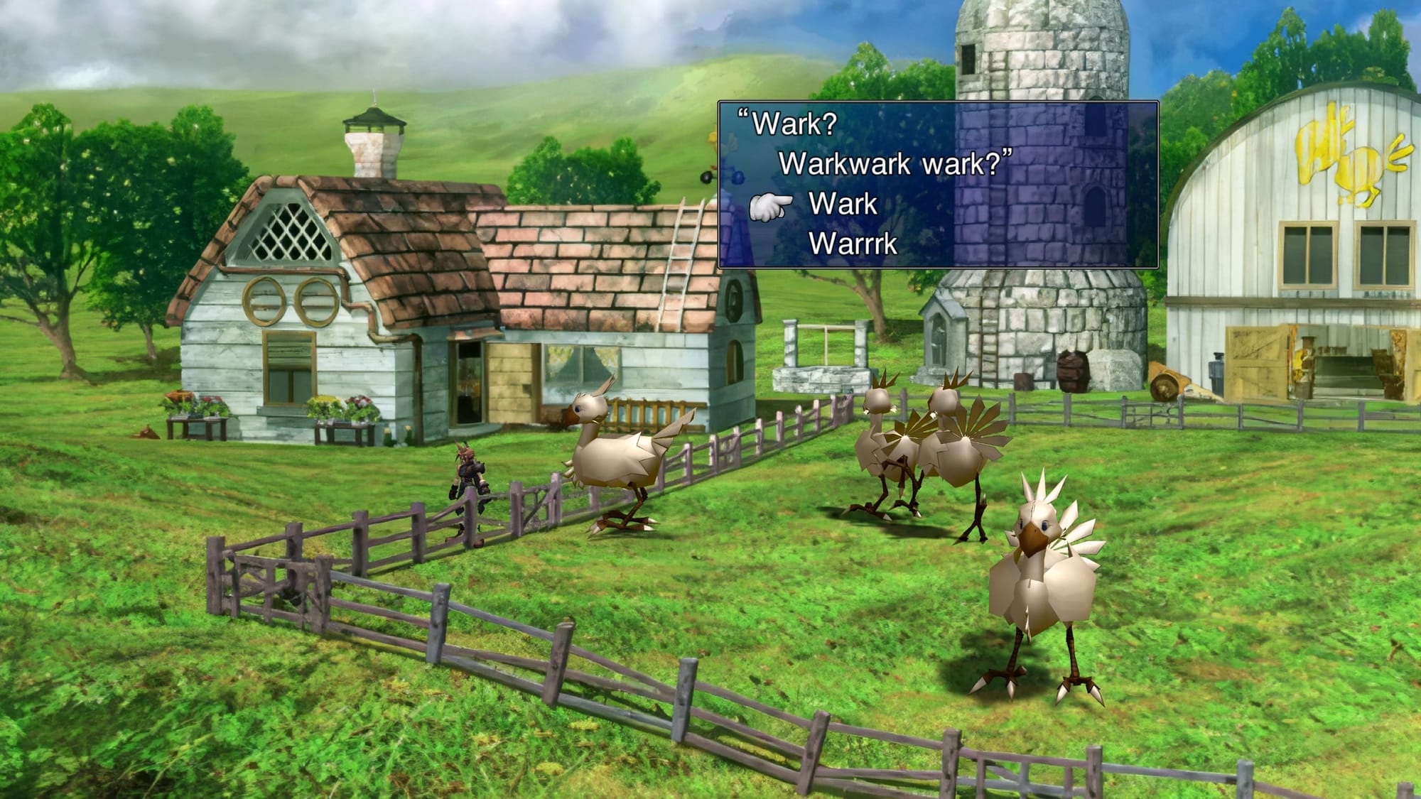 ▒ 캄 마을에서 나와 남쪽으로 내려가면 쵸코보 농장에 도착한다. 근처에 거대한 늪이 있는데 뱀 그림자 같은 것에 닿으면 미드갈즈오움이라는 이 시점에서 엄청나게 강한 몬스터와 전투가 벌어지게 되므로 우선 농장 안으로 들어가자. 우리 안에는 여러 마리의 쵸코보들이 사육되고 있는데 쵸코보에게 말을 걸여 첫 번째 답을 선택하면 쵸코보&모그리(チョコボ&モ-グリ, Choco/Mog) 소환 마테리아를 입수할 수 있다. 이 시점에서 꽤 쓸만하므로 반드시 얻자. 마테리아를 얻은 후 왼쪽의 집 안으로 들어가면 그린이 있다.