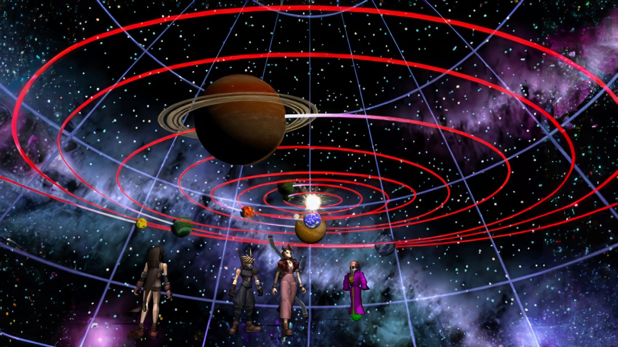 ▒ 코스모 캐년 이곳 저곳에 흩어져 있는 동료들 중 마음에 드는 두 명을 골라 다시 오자. 3층 부엌에는 캣 시가, 3층 마테리아 상점에는 유피가, 2층 장로 하고가 있는 방에는 바렛이, 1층 여관에는 에어리스와 티파가, 여관 안쪽 방에는 레드 XIII이 있다. 하지만 아무나 한 명에게 말을 걸면 파티 편성창이 나와서 자유롭게 파티를 구성할 수 있으니 모두 찾을 필요는 없다. 두 명과 함께 부겐하겐에게 돌아가면…