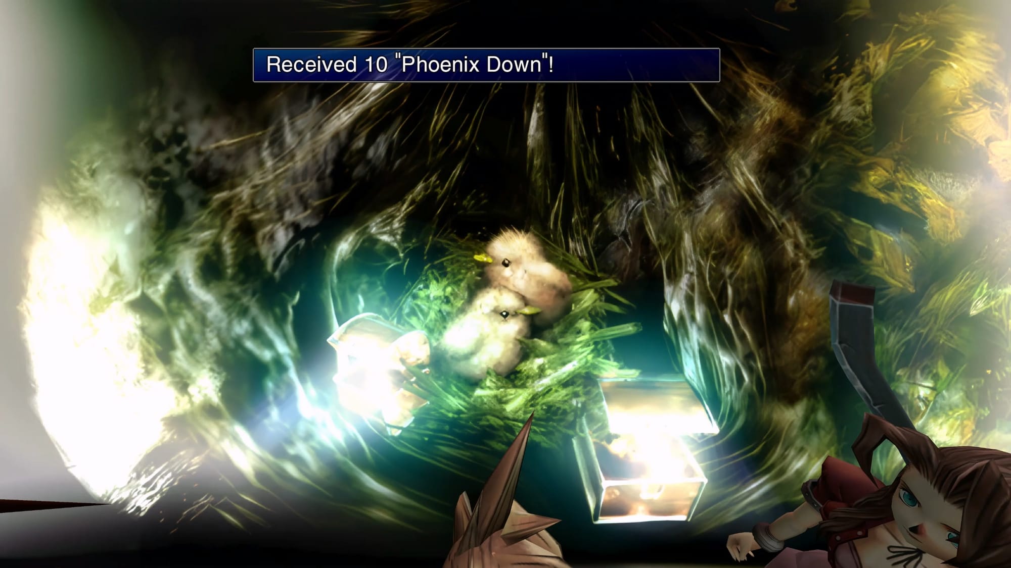 ▒ 만일 위의 대답을 선택하면 아기새들의 어미새로 보이는 코카트리스와 전투가 벌어지는데 전투에서 이기면 피닉스의 꼬리(フェニックスの尾, Phoenix Down) 10개를 얻을 수 있다. 두 번째 대답을 택하여 내버려두면 아무 의미가 없어지고, 보물을 빼앗는 것을 택하더라도 호감도에는 영향을 주지 않으므로 위의 대답을 선택하는 것이 더 이익이다. 이제 선로가 있던 맵으로 돌아와서 아래로 진행하여 새로 만들어진 다리를 건너자. 이후 두 갈래길이 나오는데 우선 아래로 진행하여 보이지 않는 오른쪽으로 들어가면 숨겨진 맵으로 들어갈 수 있다.