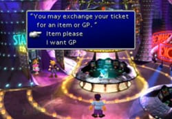 초코보 배팅이란 직접 초코보를 타고 레이스에 참여하는 것이 아니라 선수들을 살핀 후 레이스의 순위를 알아 맞추는 것입니다. 마치 TV 중계를 보는 것처럼 여러 가지 앵글로 레이스를 지켜볼 수 있어서 색다른 느낌을 받으실 수 있습니다. 하지만 배팅으로 아이템을 얻기 보다는 직접 레이스에 나가서 1등을 하는 편이 좋습니다. 배팅을 하기 위해서는 가운데에 있는 카운터에 말을 걸어서 200길 짜리 초코보 티켓을 사야 합니다. 그후 L, R 버튼으로 레이스에 참여하는 초코보들을 살펴본 후에 1, 2위가 유력시 되는 초코보들의 번호가 적힌 카드를 고르면 됩니다. 레이스에서 3등안에 들면 등수에 따른 상품을 받을 수 있는데 이 상품은 나중에 골드 소서 내에서 통용되는 화폐인 GP로도 교환이 가능합니다. 참고로 배팅에도 C, B, A, S 클래스가 있는데 C 클래스의 초코보 티켓은 100 Gil, B 클래스는 200 Gil, A 클래스는 300 Gil, S 클래스는 500 Gil 입니다. S 클래스로 갈수록 상품으로 등장하는 아이템이 점점 좋아지죠.