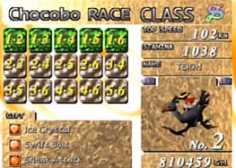 Disk 2나 3에서 초코보 우리를 구입하고 초코보를 잡은 후 초코보를 기르기 위해서는 레이스에 내보내야 합니다. 우선 초코보 레이스에 참가하려면 화면 왼쪽에 있는 에스터에게 말을 걸어 레이스 참가 의사를 밝히고 플레이어가 보유하고 있는 초코보 중에서 경주에 내보낼 녀석을 선택한 다음 LONG/SHORT 중 하나의 코스를 선택하면 됩니다. 참고로 자신의 초코보가 스피드는 빠르지만 스테미너가 적을 때에는 SHORT 코스가, 그 반대일 경우에는 LONG 코스가 유리합니다. 레이스 도중 SELECT 키를 누르면 초코보를 자동/수동으로 조작할 수 있습니다.(전속력은 O버튼 연타로 하면 됩니다. 참고로 제 경우에는 서서히 속도를 높일수 있는 □ 키를 자주 이용합니다. 또한 R1 + R2 키를 누르면 스테미너가 조금씩 상승합니다.) 이 레이스에서 반드시 1등을 해야만 초코보의 랭크가 오르기 때문에 초코보 키우기를 소홀히 하면 좋은 결과를 얻을 수 없습니다.(한마디로 1등 외에는 모두 도루묵이라는 말씀~) 참고로 랭크는 C → B → A → S의 순으로 오르게 됩니다. 즉 C 클래스에서 3회 1위를 하면 B 클래스가, B 클래스에서 다시 3회 우승을 하면 A 클래스가 되는 것이죠. 1등을 하면 상품을 타게 되는데 높은 랭크에서 1등을 하여 상품을 탈수록 좋은 상품을 타게 됩니다. 이 상품은 상품 그대로 받을수도 있지만 GP로도 받을수 있으며 S 랭크 우승시 등장하는 각종 마테리아나 방어구의 경우에는 최고 500GP까지 바꿀수 있으므로 적절히 활용하세요.
