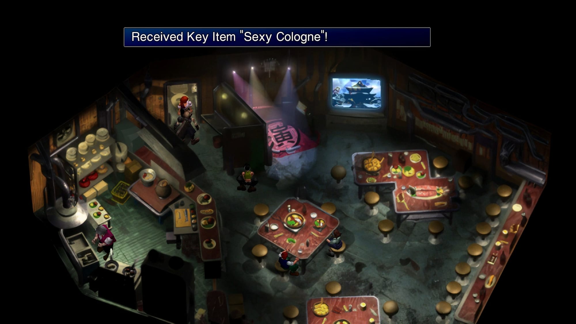 약을 가지고 이제는 양복점 주인이 있었던 술집의 화장실로 가 봅시다. 화장실에는 어떤 여자가 변비로 고생하고 있는데 이 여자에게 아까 얻은 소화제를 주면 여자는 그제서야 시원하게 볼일을 보게 되고 감사의 표시로 클라우드에게 섹시한 향수(Sexy Cologne, セクシ-コロソ)를 줍니다.