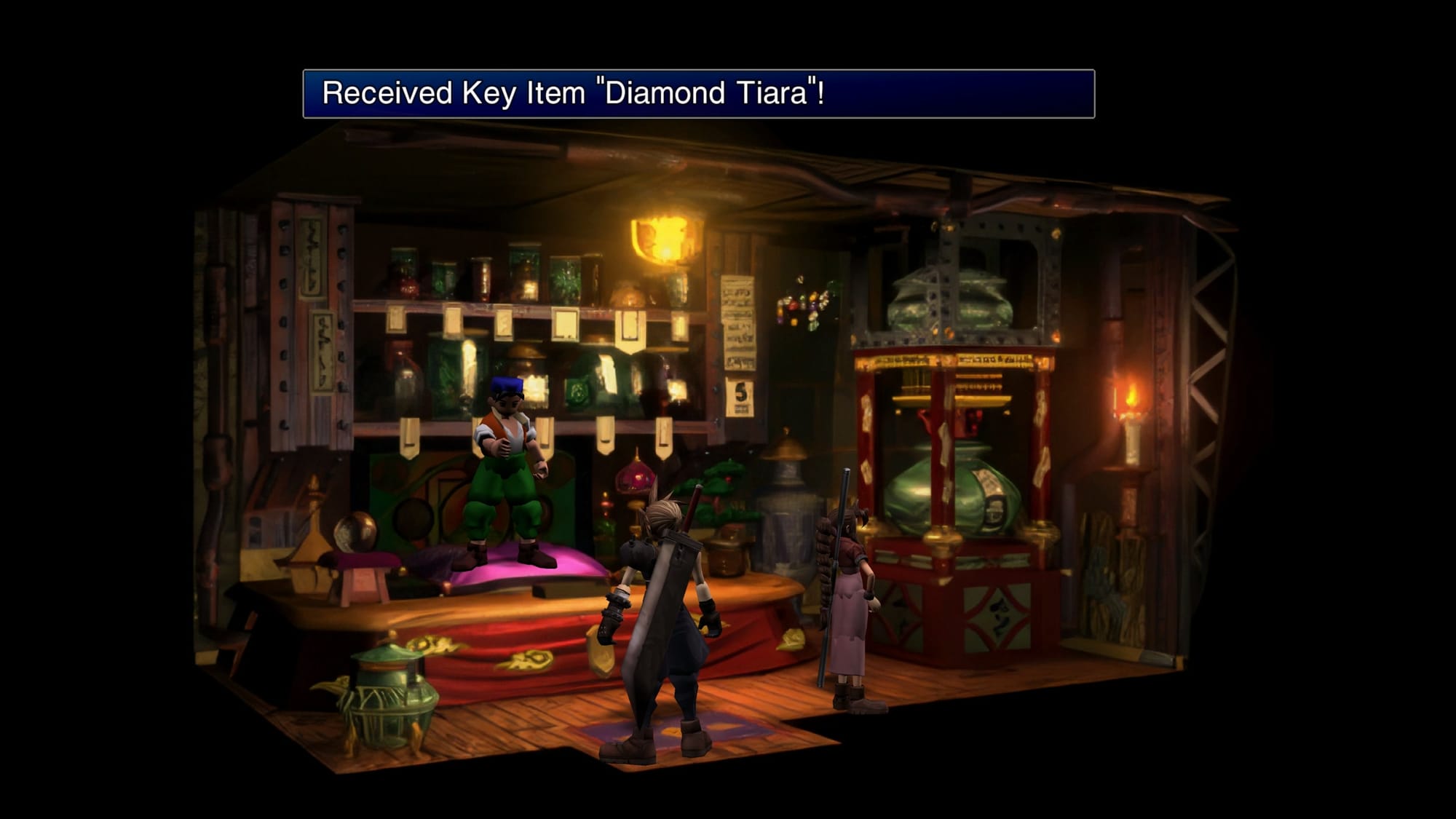 월마켓 오른쪽 위에 마테리아 상점으로 가보면 주인이 마테리아는 팔지 않고 누워만 있습니다. 말을 걸어 보면 에어리스는 잠깐 빠져달라고 하는데요... 뭔 얘기일까나... 이 사람은 클라우드에게 무언가 은밀한 물건을 여관에 있는 자판기에서 뽑아 달라고 합니다. 부탁을 승낙한 후 여관에서 가서 하룻밤을 자게 되면 밤에 자판기에서 물건을 뽑을 수 있는 기회가 생기는데 이때 가장 비싼 200 Gil 짜리 물건을 뽑아서 마테리아 상점 주인에게 가져다 주면 매우 고마워 하면서 클라우드에게 다이아몬드 티아라(Diamond Tiara, タイアのテイアラ)를 줍니다. 헌데 과연 자판기에서 뽑은 물건이 뭘까나???