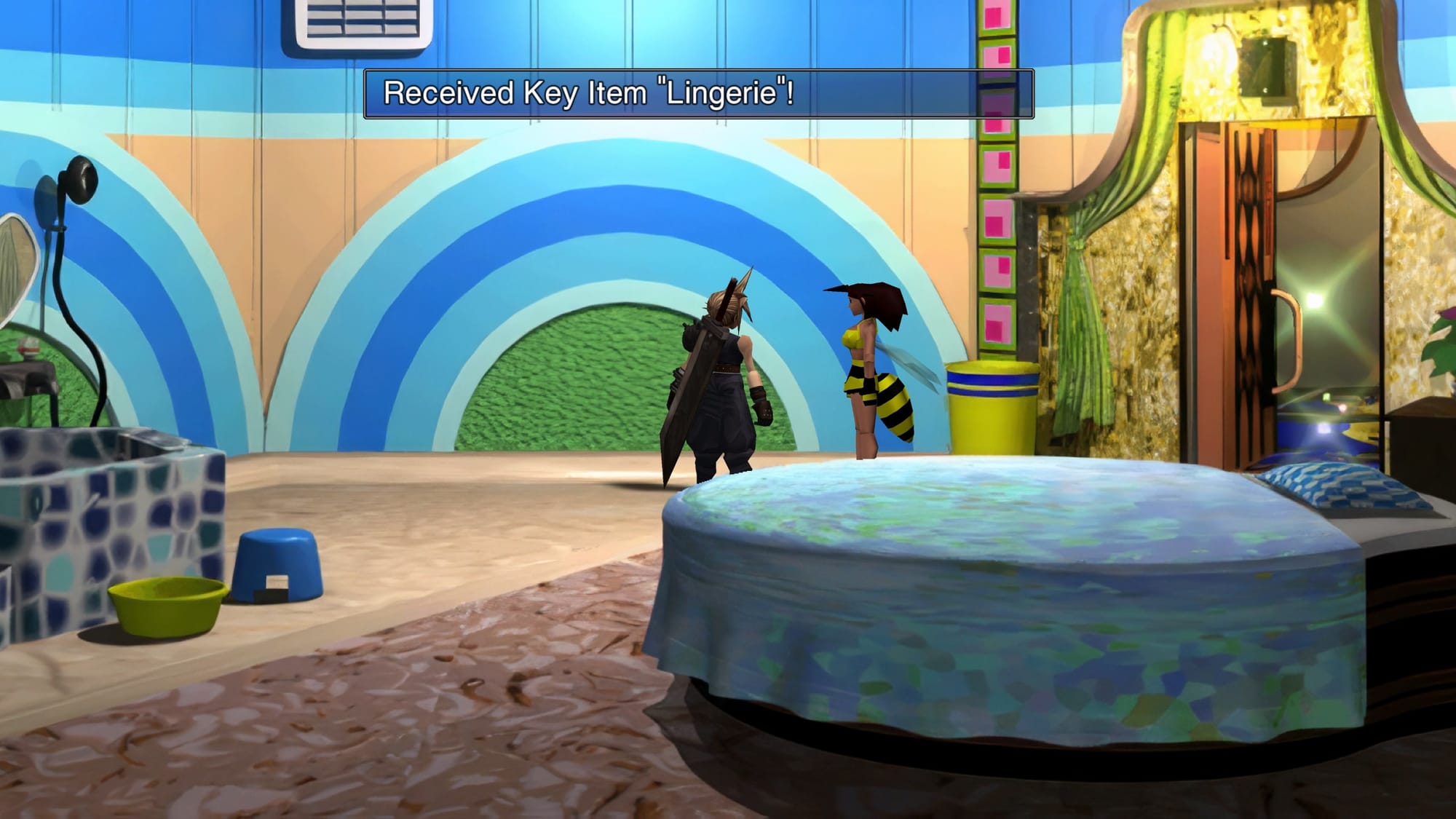 월마켓 오른쪽 아래에 서성거리고 있는 남자에게 말을 걸면 벌꿀관으로 들어갈 수 있는 회원증을 줍니다. 이것을 얻은 후에 벌꿀관 안으로 들어가서 9시 방향에 있는 문을 선택합시다. 안으로 들어가면 또 한명의 클라우드와 같은 것이 있는데 이것을 본 진짜 클라우드는 머리를 움켜쥐더니 정신을 잃게 됩니다. 벌꿀관 경비의 뺨을 수십차례 맞은 후에야 정신을 차린 클라우드... 벌꿀관의 여주인은 매우 미안해 하는데 방을 나가기 전에 여주인에게 말을 걸면 비키니 팬츠(Bikimni Pants, ビキニパソシ) 또는 란제리(Lingerie, ラソジエリ-)를 받을 수 있습니다. 이런것 까지 입어야 한단 말야...