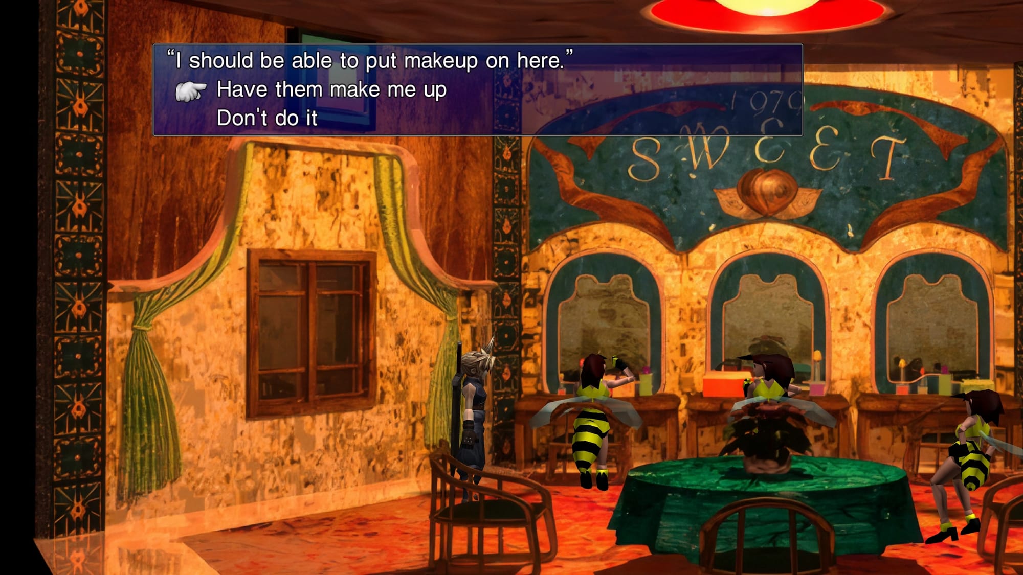 벌꿀관을 나서기 전에 12시 방향에 있는 방으로 들어갑시다. 벌꿀관의 여직원들이 열심히 화장을 하고 있는데 이들 중 한명에게 말을 걸면 클라우드에게 화장을 해 줍니다. 클라우드... 이런 짓까지...