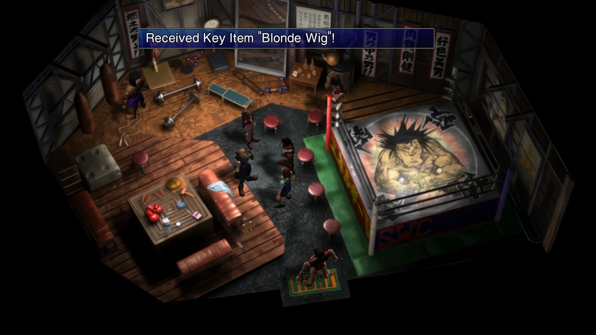 아래 아이템들을 얻은 후에 양복점으로 가보면 양복점 주인이 드레스를 다 만들었다며 매우 흐뭇해 하고 있습니다. 자~ 이제 입어봐야 겠죠? 얌전한 숙녀옷을 입긴 했지만 에어리스는 아무래도 가발이 필요한 것 같다고 말합니다. 역시 클라우드의 삐죽머리로는 무리겠죠? 게다가 잘 손질도 안할테니...--; 가발을 얻기 위해서는 남남남(男男男)이라고 적혀 있는 체육관 안으로 들어가야 합니다. 여기서 한 남자와 제한 시간동안 앉았다 일어났다 하는 운동을 누가 더 많이 하는가 겨루게 됩니다.
